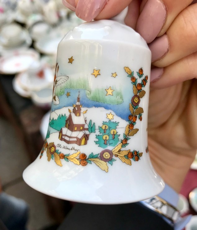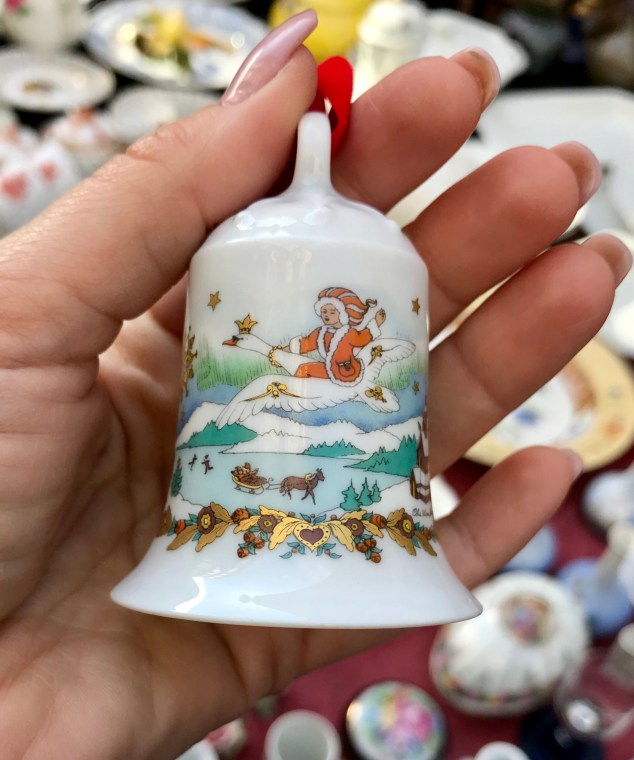 Sen hittade jag den här lilla söta julklockan också! Jag funderade länge på om den skulle få följa med mig hem, men när jag såg prislappen (35€!) så ställde jag försiktigt tillbaks den igen efter att ha fotat alla fina detaljer i den förgyllda dekoren…