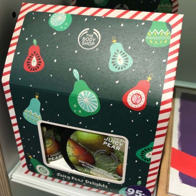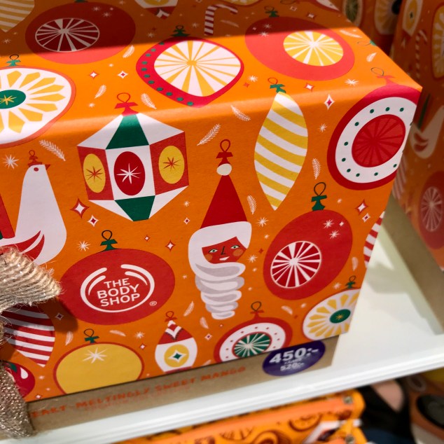 Följde med dottern in på Body Shop i helgen eftersom hon skulle köpa födelsedagspresent till en kompis. Under tiden hon botaniserade bland dofter och produkter passade jag på att spana in årets julförpackningar som verkligen är hur söta som helst, kolla bara! Juliga, färgglada och retro så det förslår! Motiven hade lika gärna kunnat sitta på någon tryckt jultextil från 60-talet.