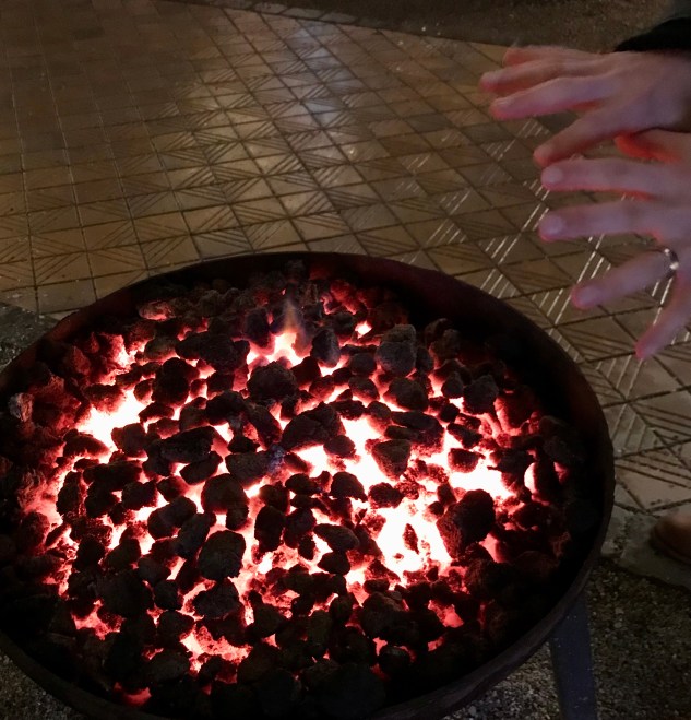 Ett sätt att hålla värmen på; stora fat med glödande kol..
