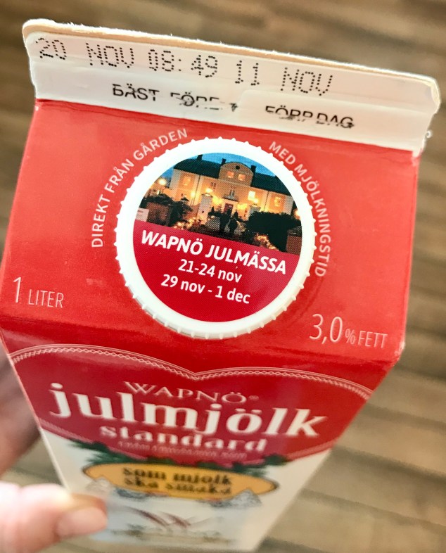 Det är Wapnö, ett litet lokalt mejeri i närheten som upprepar konceptet julmjölk i år igen! Egentligen är det helt vanlig standardmjölk i paketet men det blir onekligen roligare att handla mjölk nätdejt står julmjölk på paketet! 🙂