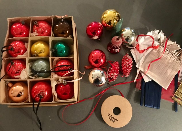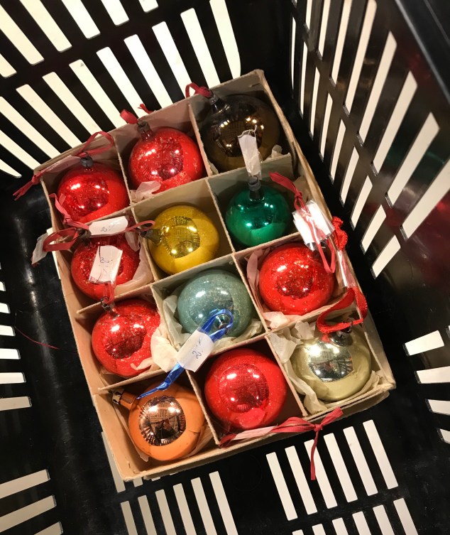 En hel låda med lövtunna glaskulor för 2kr styck! När jag kom till kassan så visade det sig att alla julsaker var nedsatta till halva priset så 12kr landade det på! Dessutom fick jag tips om ”finkulorna” som de lagt åt sidan i en monter vid kassan..