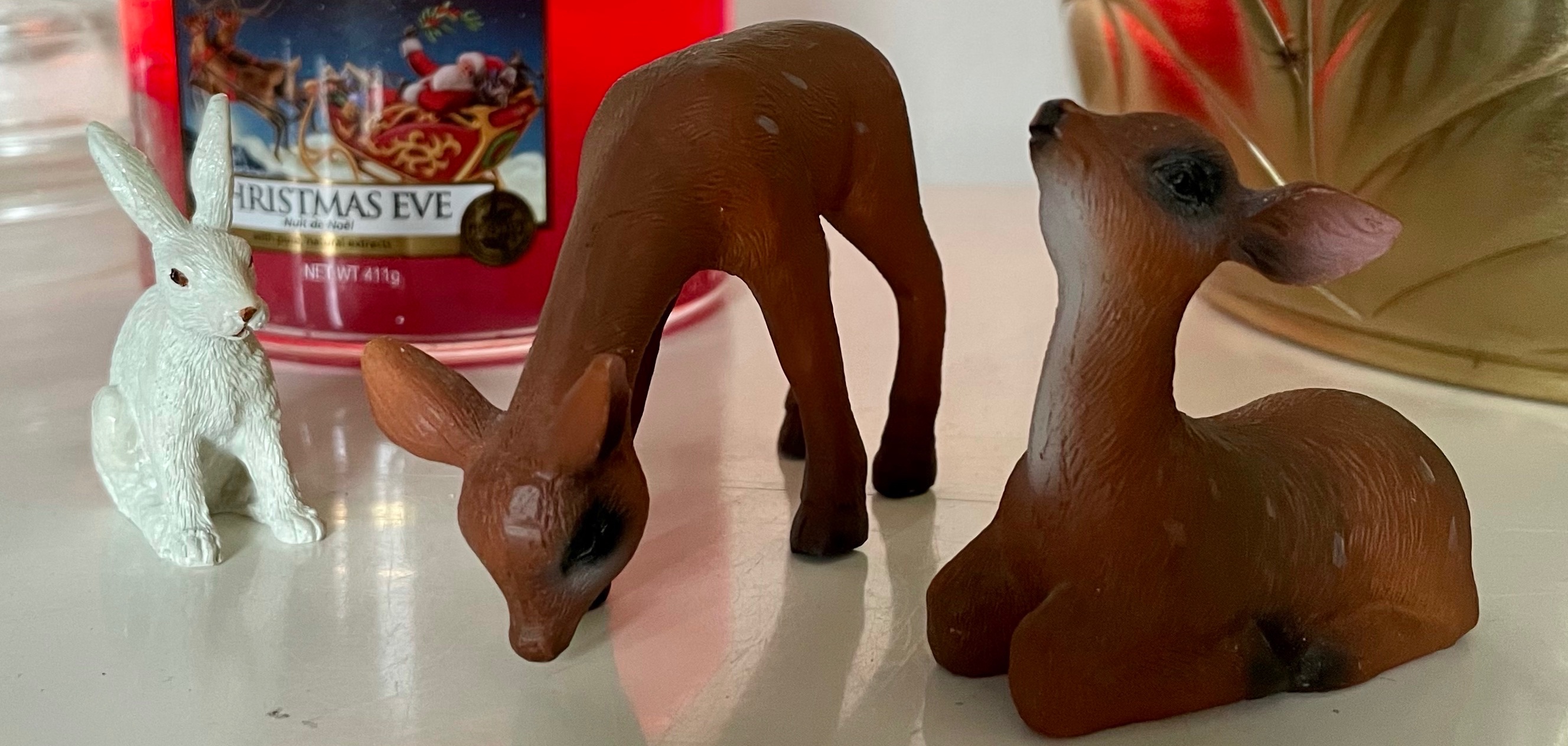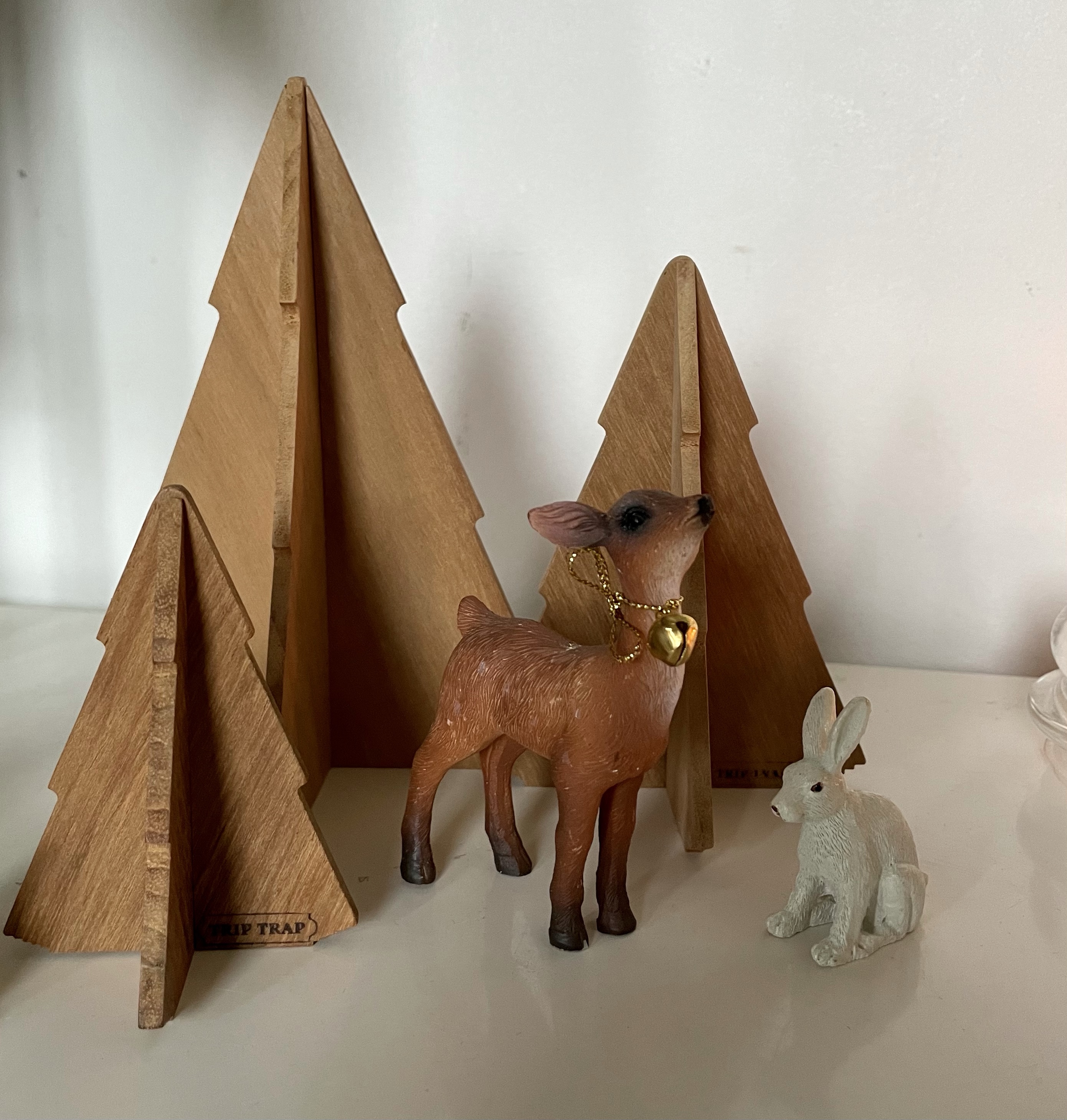 Djuren i plast är inköpta i en leksaksaffär och de olika granarna är i trä så de håller också att lekas med. Perfekt kombination av dekoration och sysselsättning! 🙂