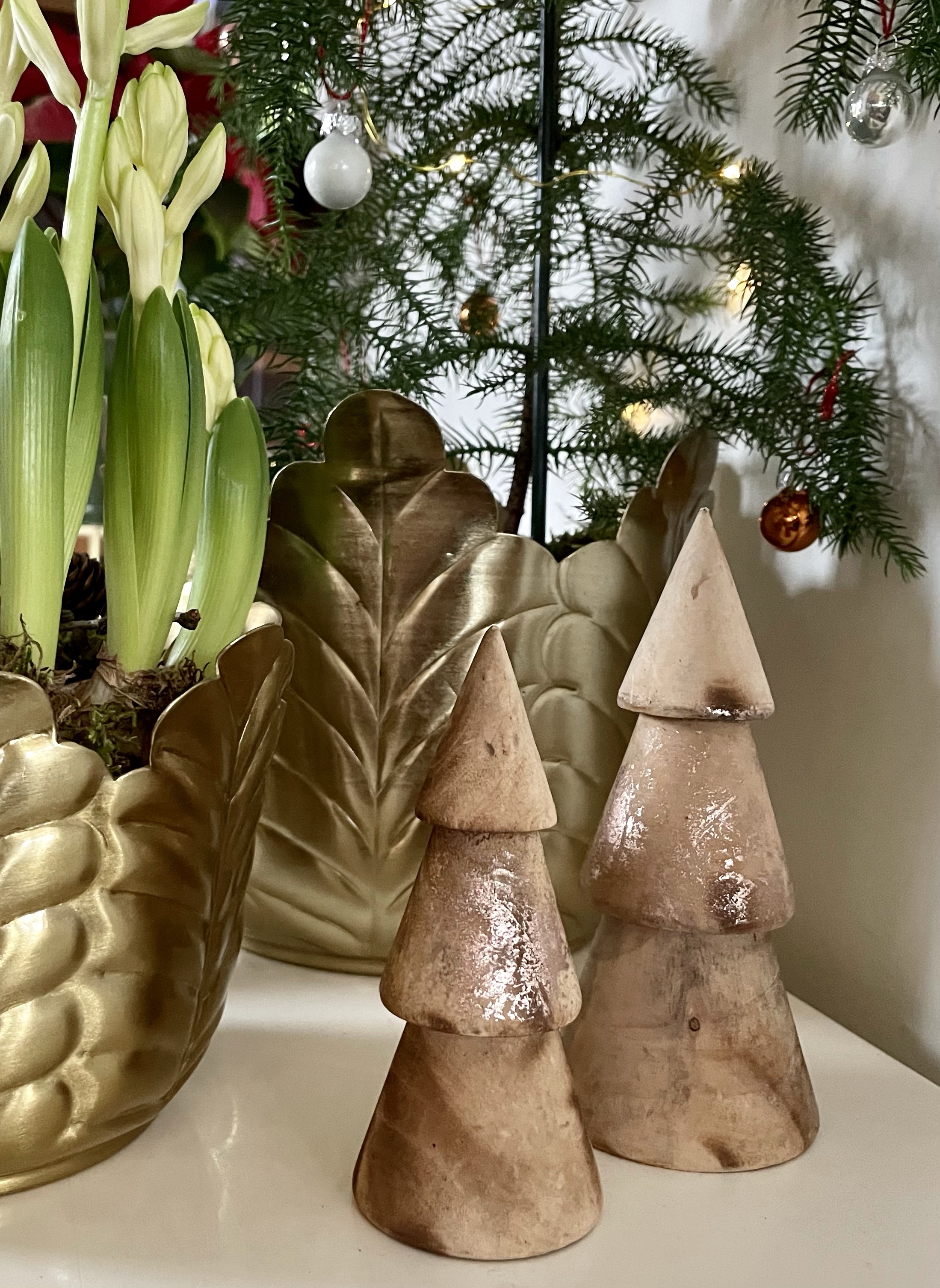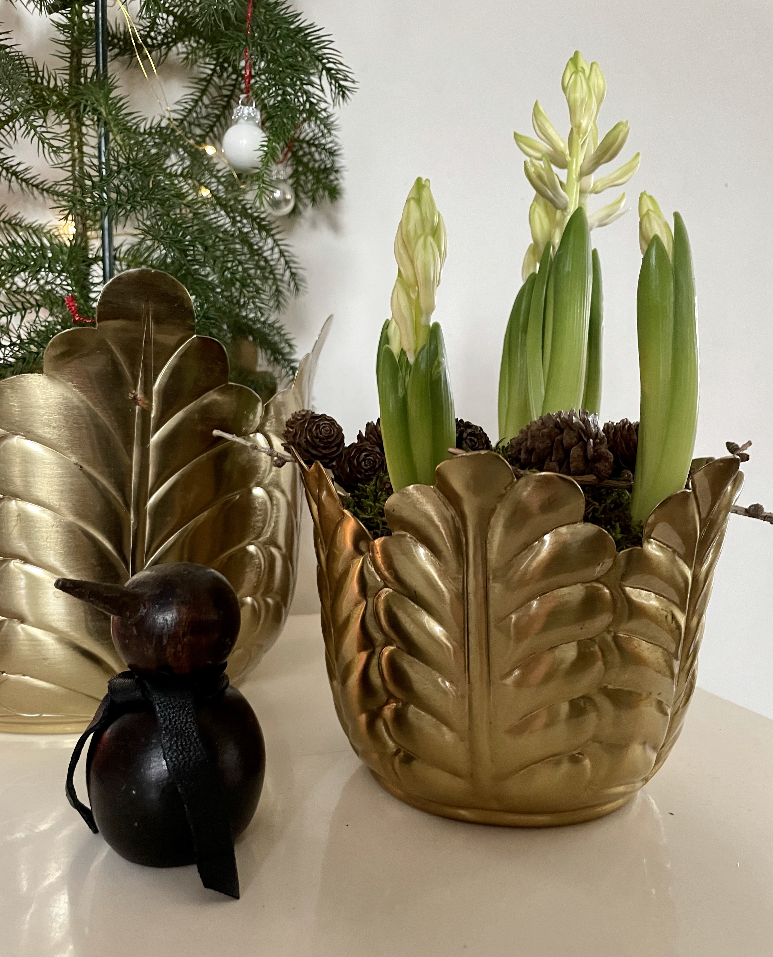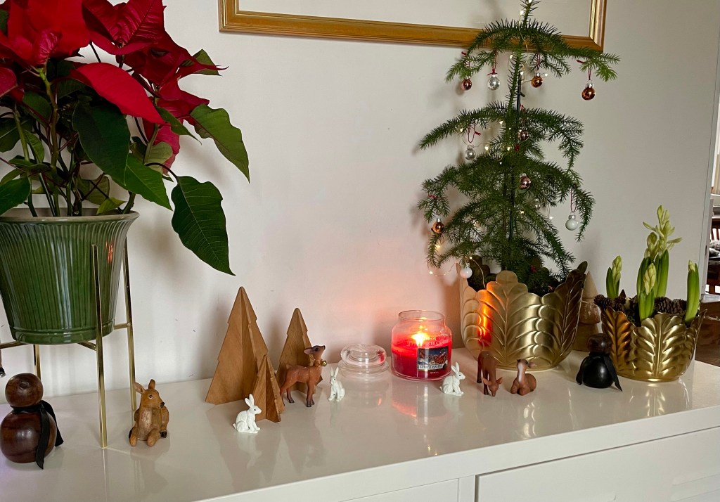 Julstjärnan med de fina lockande röda bladen fick flytta upp en våning utom räckhåll för små nyfikna händer, och doftljuset och rumsgranen står så långt in på bänken att hon inte når dem. Hyacinten får jag ha lite koll på om hon visar intresse för men resten av pyntet är barnvänligt!