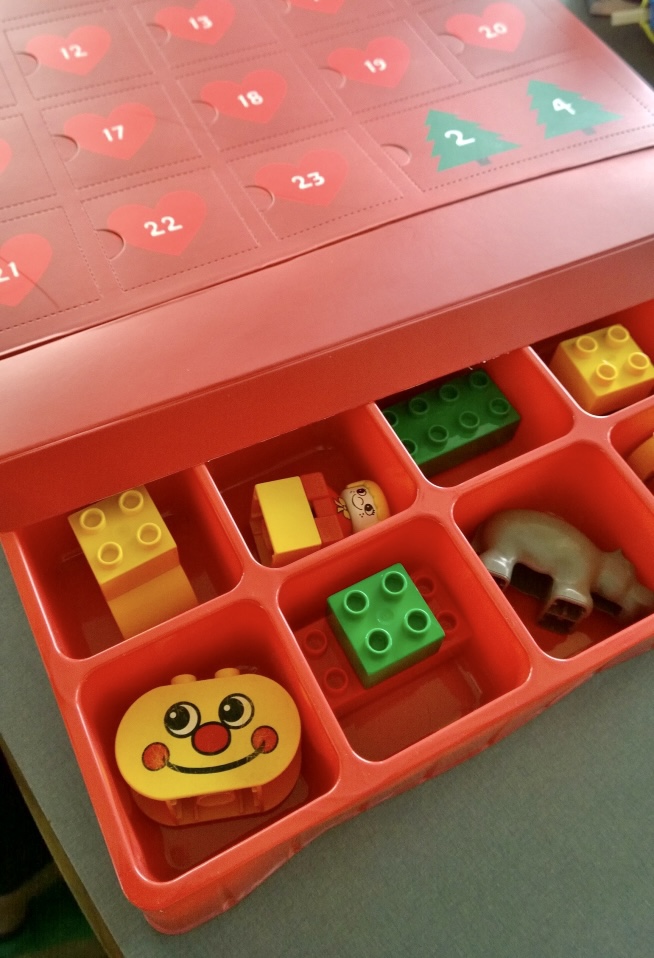 Hon får brorsans ärvda Duplo i en ”fyll-själv-kalender”, precis som han fick för fem år sen när han ärvde Duplot från sin storasyster.. Den kalendern var så populär och han älskade att öppna luckan varje morgon och se vad som gömde sig bakom den. Tacksam att göra var den också, Duplot hade vi ju redan så det var bara att stoppa stoppa ner en gubbe eller annan rolig bit i hålet och stänga!
