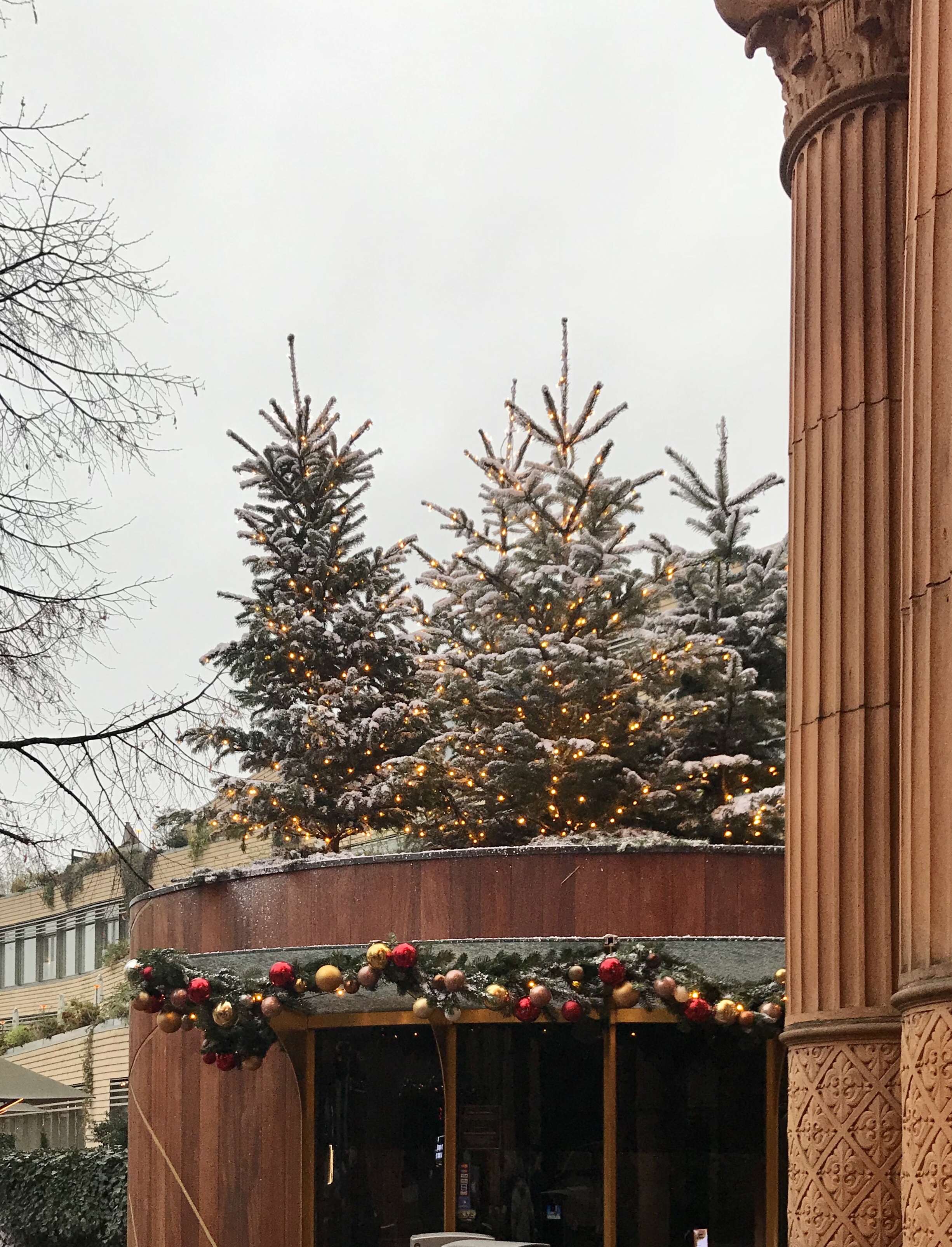 Men Nötknäpparna stod som vanligt på plats utanför huvudentrén och portalen var dekorerad med belysning och snöklätt granris så det räckte att gå in genom den för för att julkänslan skulle infinna sig!