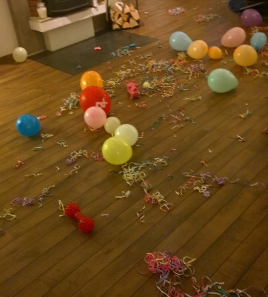 Lite senare på kvällen (efter att vi vuxna njutit av vår goda mat och dryck i fred) såg vårt vardagsrumsgolv ut så här efter ungarnas framfart!