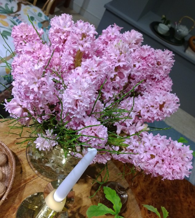 Sprang inom Svenskt Tenn idag och hittade det här jättefånget med rosa doftade snitthyacinter. Den idén kommer jag ta med mig hem och anamma i jul. Varför måste hyacinter alltid stå på lök? I år ska jag testa snittblommor också!